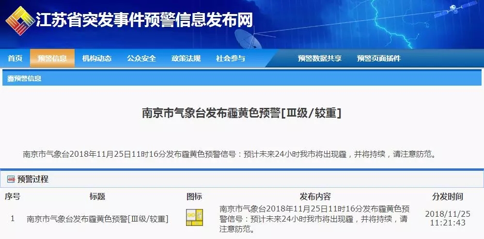 南京市氣象臺發布了霾黃色預警信號,